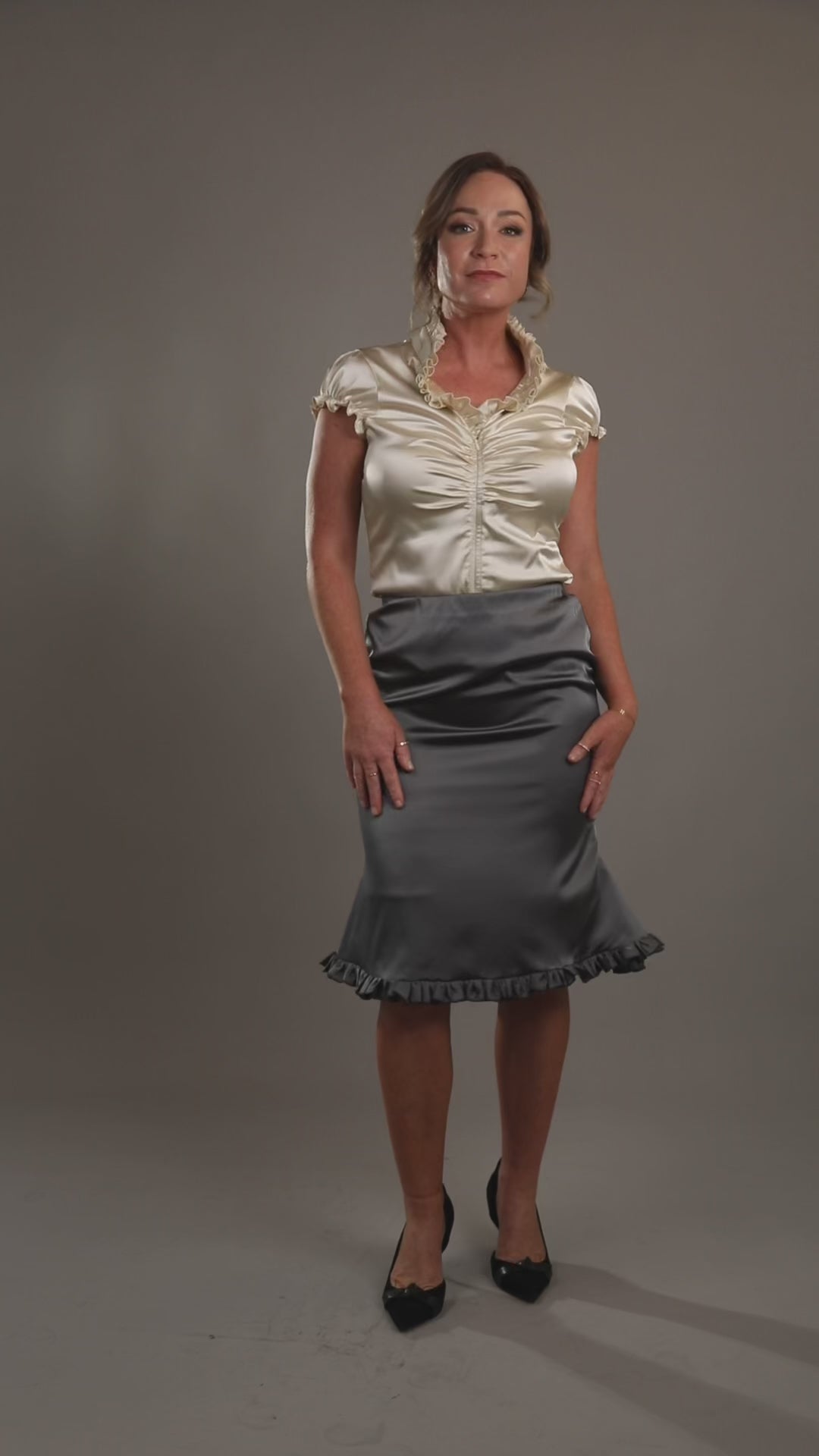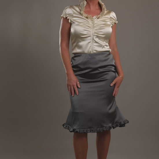 This soft satin Talia Skirt perfectly complements the Talia Top, featuring a matching frill line along the hem for a cohesive, elegant look.