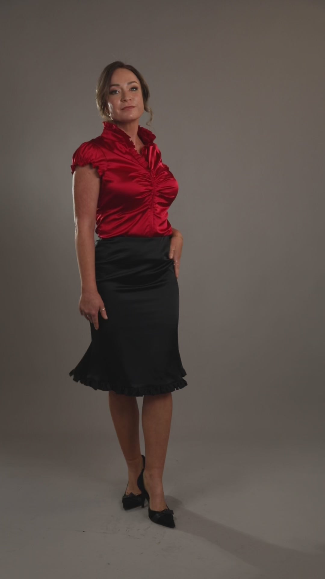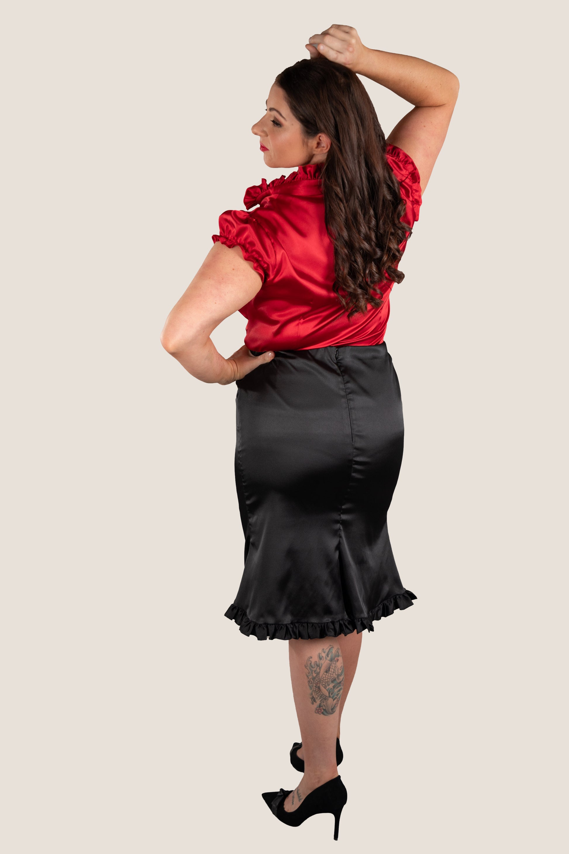 This top has an invisible zip that slides all the way down, easier to put on too. It also has gorgeous ruching along the bustline that follows your bust and you can zip that decolletage to suit you. There is a frill that follows the collar down to the bustline to show off a beautiful flattering V neckline as well as around the arms.